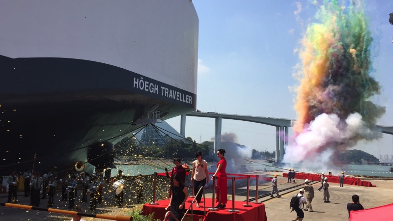 The spouse of Akihiko Hiraoka, Executive Vice President of Hitachi Construction Machinery Co Ltd, Harumi Hiraoka, named the vessel “Höegh Traveller” at the traditional ceremony.